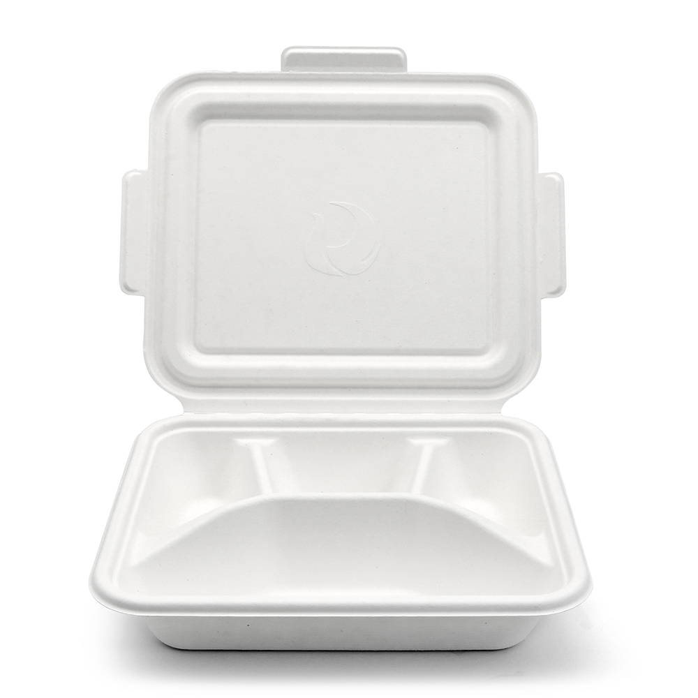 Serve sustainably with these 4-compartment bagasse compostable containers made from eco-friendly bagasse and bamboo fibers. Certified biodegradable by OK COMPOST, BPI ASTM D6400/D6868, EN13432 standards.